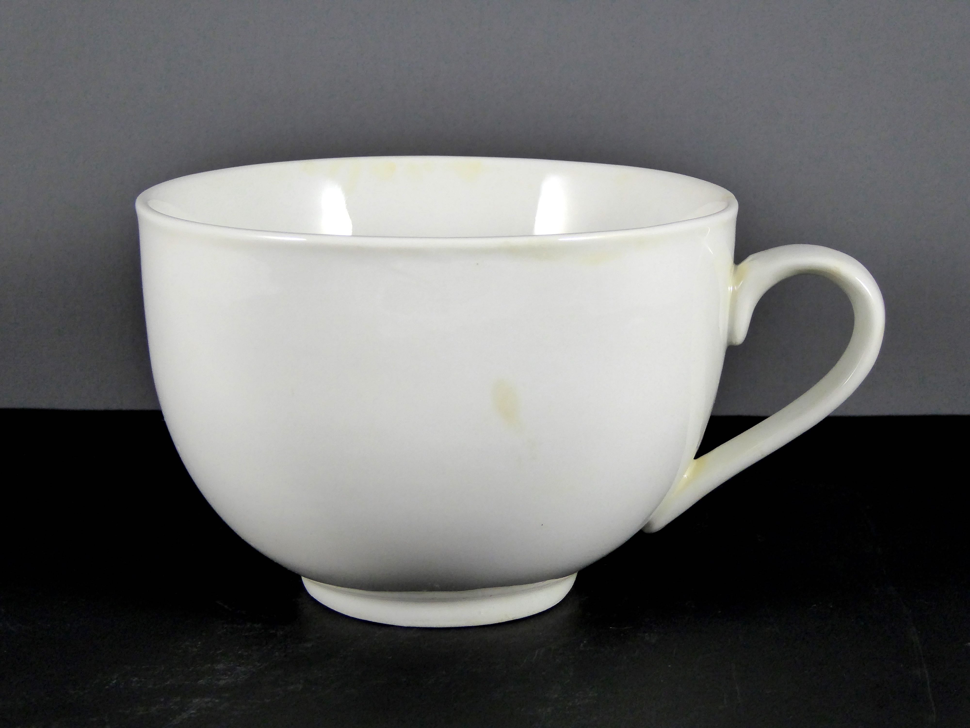 #13035 MUG 16 OZ. – Used Ceramic Teacup/Small Coffee Cup for Hot Beverages, Minimalist Design with Yellowish Stains, Sold by the Case