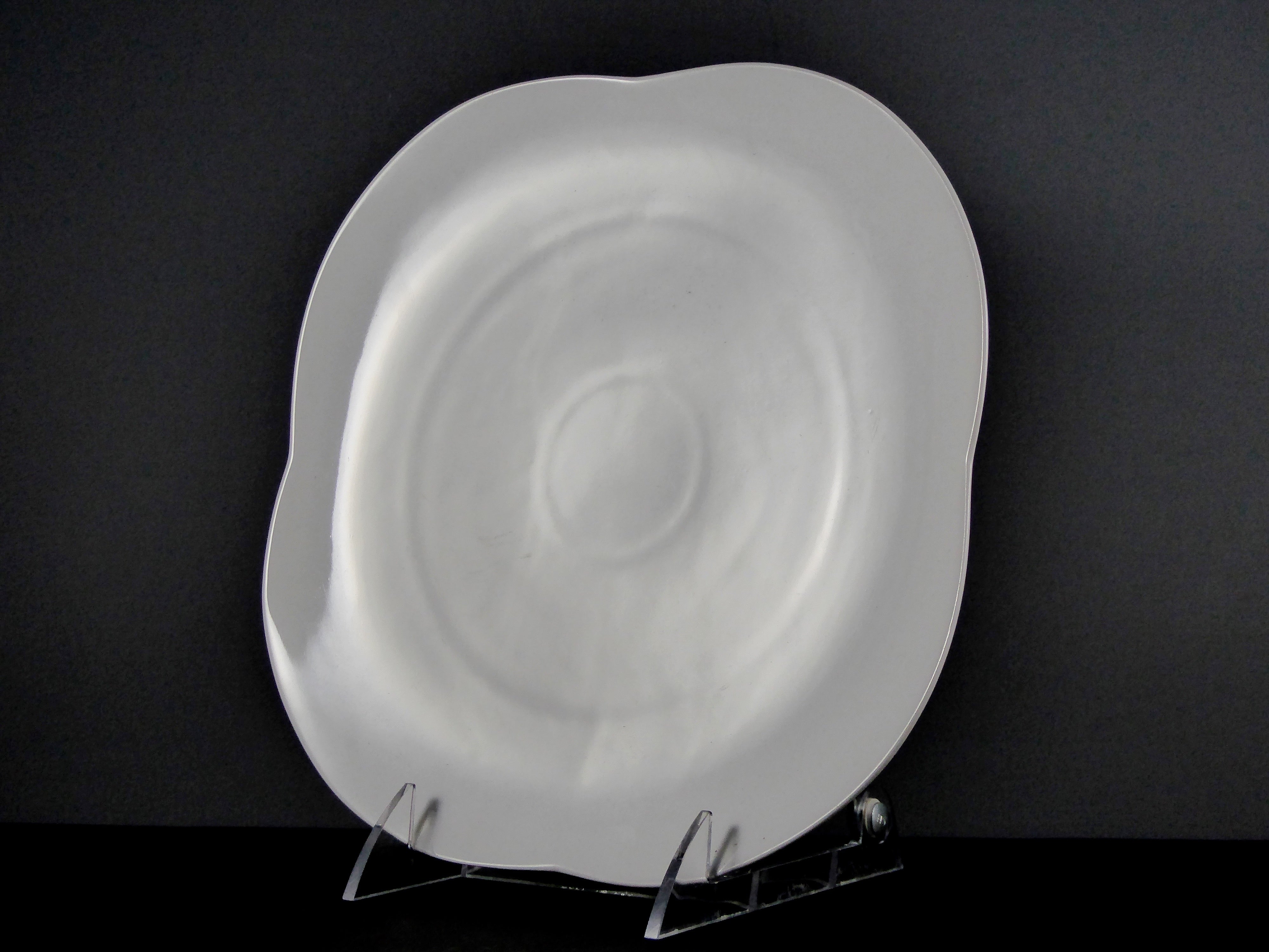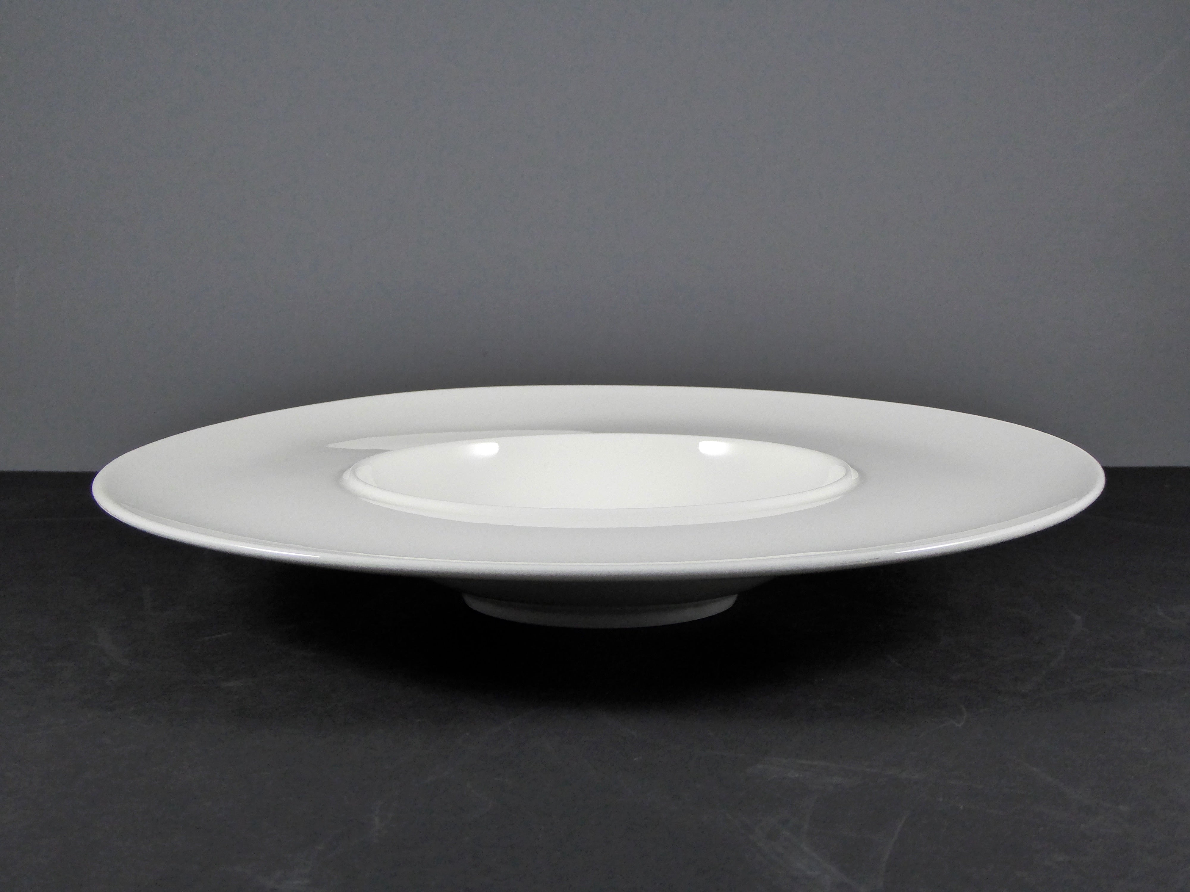 The plate has an outer diameter of approximately 12 – 14 inches (30 – 35 cm), larger than a standard dinner plate. The central recess, which is 2 – 3 inches deep, can hold a small to medium portion of food such as soup, pasta, or a salad. The outer rim, with a width of about 2 – 3 inches, provides a space for side dishes, bread, or garnishes.