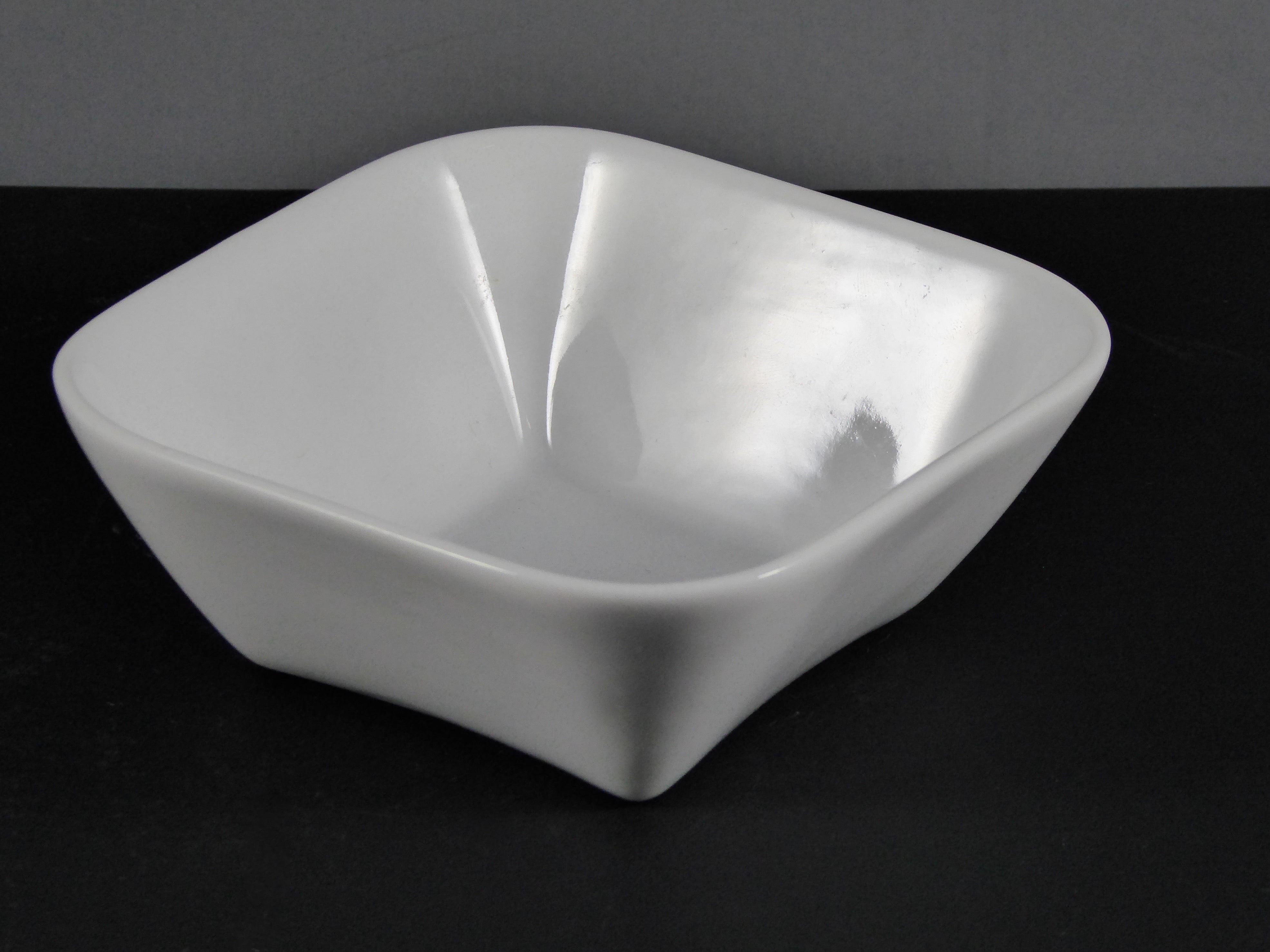 | Design | Square base with rounded, beveled edges; shallow, wide shape with inward – sloping sides; smooth, glossy finish |