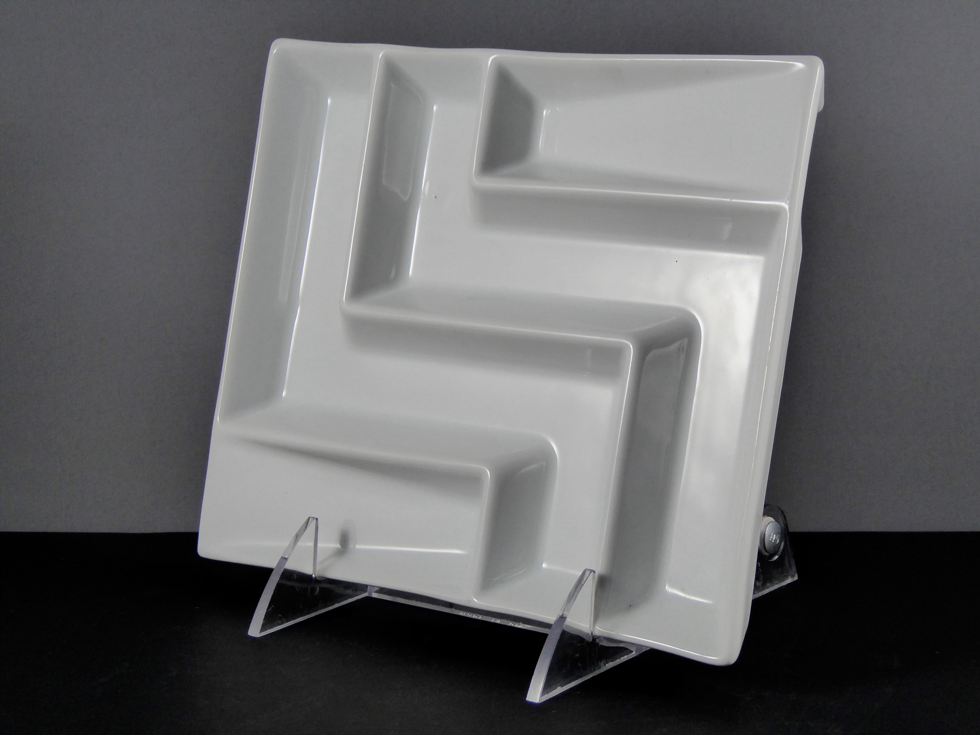 The platter showcases high – quality craftsmanship with clean, precise mold lines, no visible cracks, uneven glazing, or rough edges. Its uniform, glossy white glaze has a consistent sheen, and the solid, seamless design along with thick dividers suggest excellent durability for daily or decorative use. It comes with a clear acrylic stand, indicating its status as a premium or decorative piece, suitable for display on tables, buffets, or as a centerpiece.