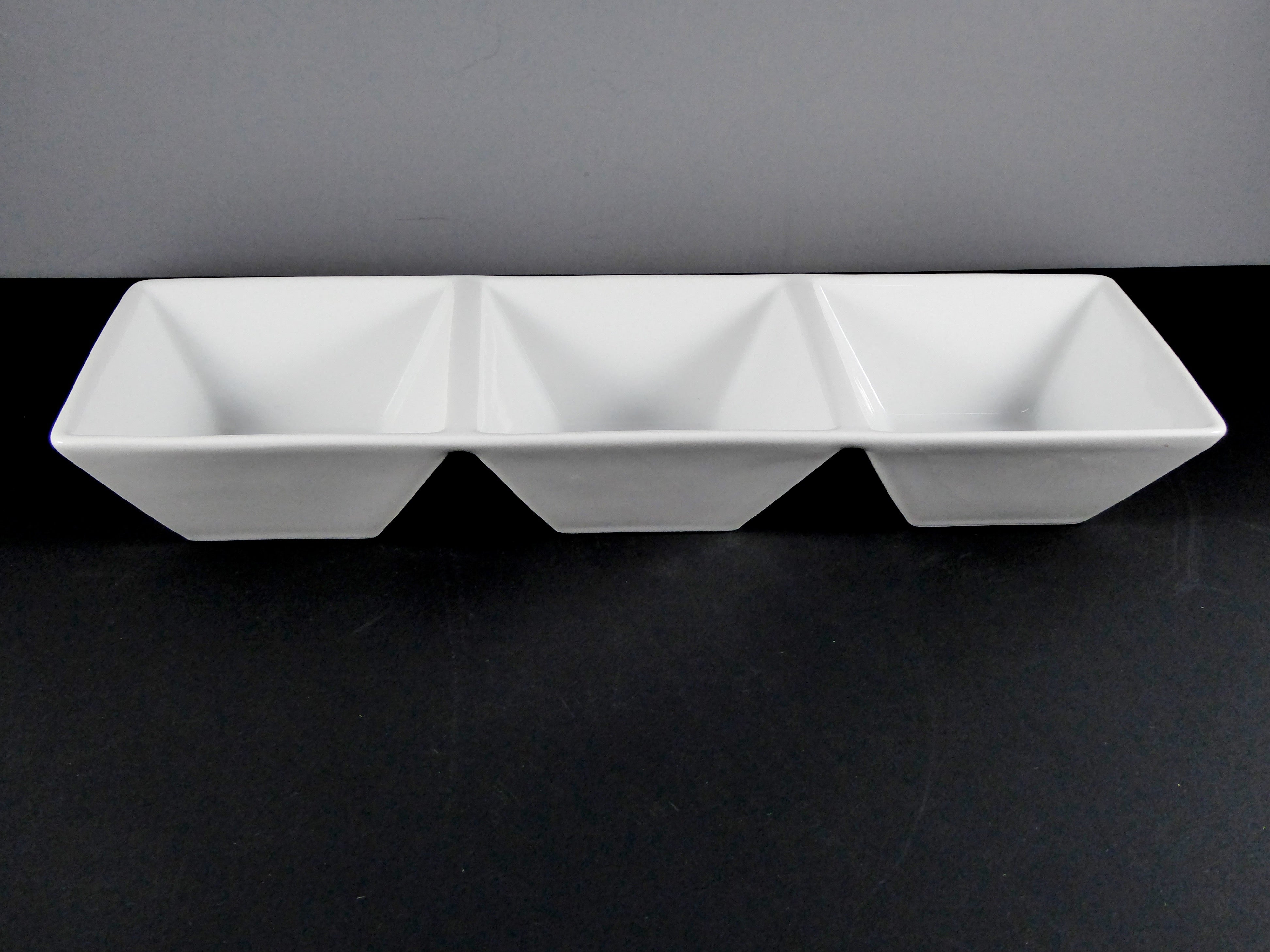 The dish comes in a solid white color, presenting a geometric, angular, and minimalist design. Its three shallow rectangular compartments are seamlessly connected in a linear, horizontal arrangement. Each compartment has sloped sides and a “pyramid – like” interior, which is wider at the top and narrower at the bottom. This shape not only maximizes capacity but also prevents food from spilling, whether it’s liquids or dry snacks.